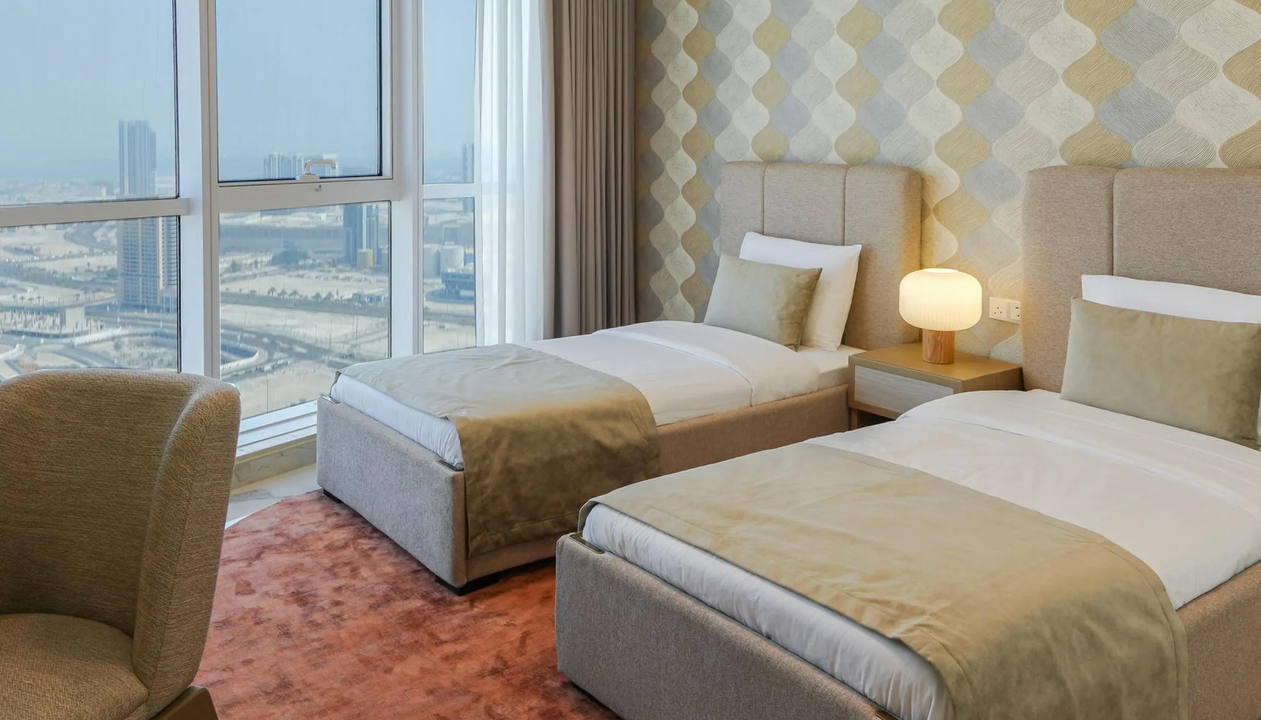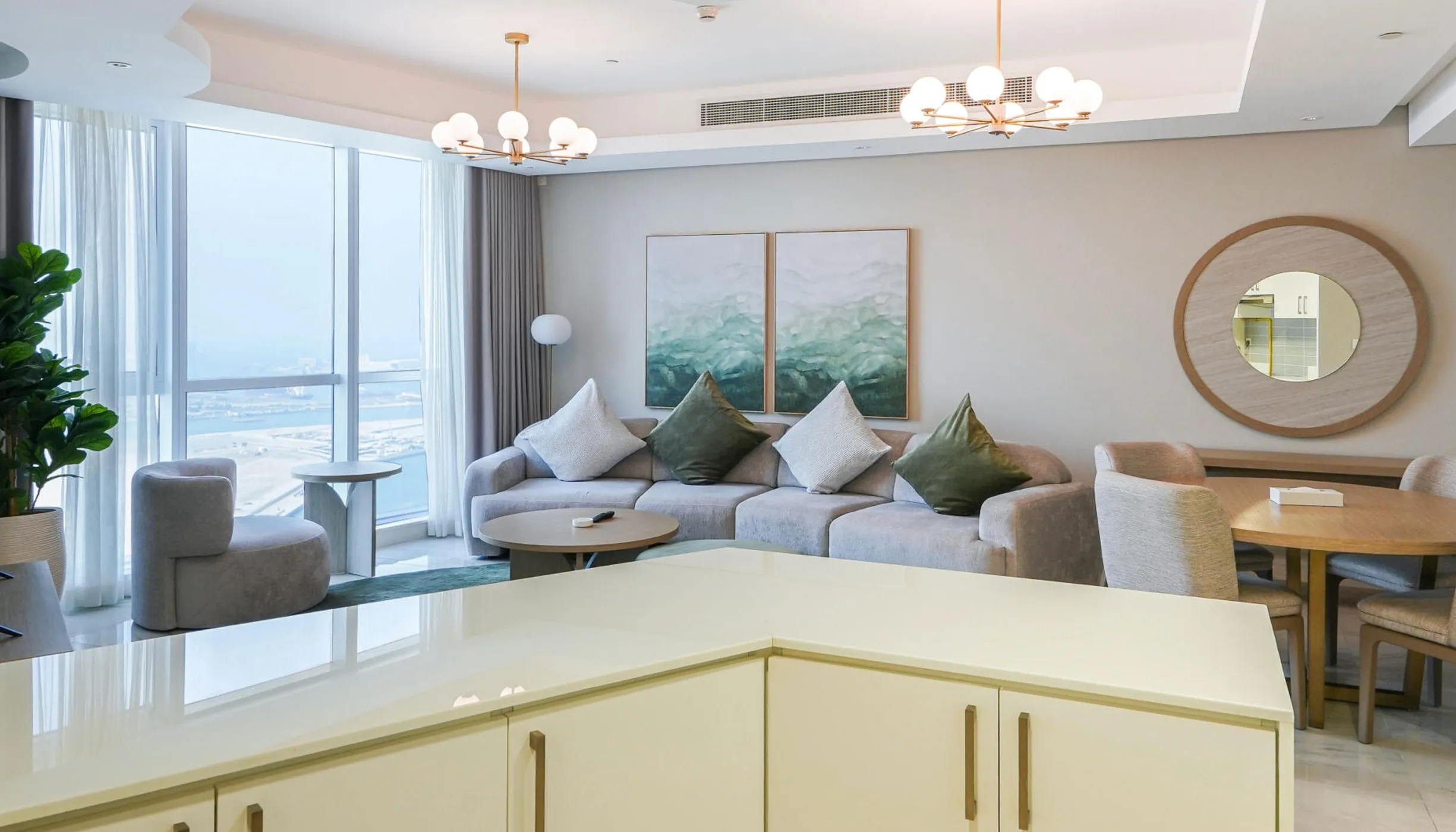 The tower’s upper floors (32–56) include 322 brand-new, fully furnished apartments, ready for immediate move-in. Spacious layouts, large windows, and open views of the city and the sea make each home bright and comfortable. Interiors are finished in calm, natural tones with built-in wardrobes, fitted kitchens, and modern appliances.