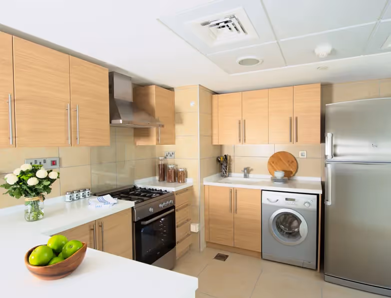 جميع المطابخ مجهزة بغسالة صحون وغسالة ملابس وثلاجة ومجمدة وموقد.