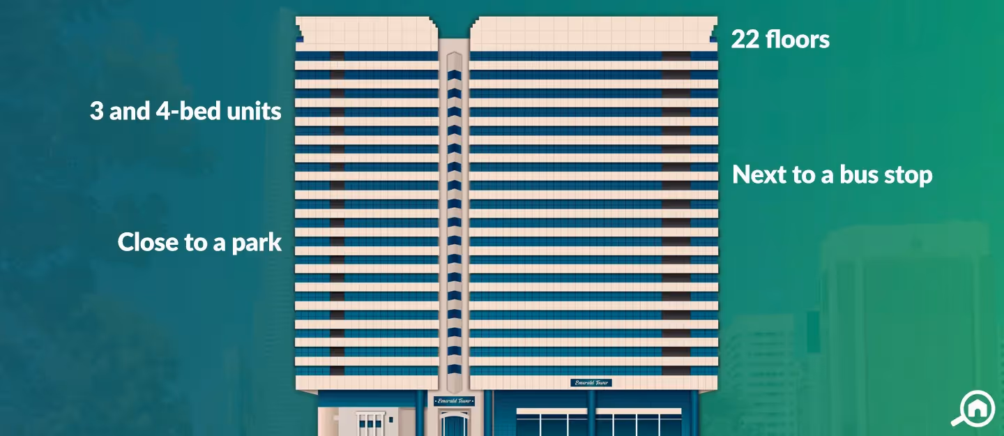 تحظى العقارات في إميرالد تاور بشعبية لدى العائلات التي لديها أطفال نظرا لموقعها المميز بالقرب من العديد من مرافق البنية التحتية والشواطئ والمكاتب وأماكن الترفيه. يوفر المجمع مساكن حديثة وأنيقة مع تصميمات واسعة.