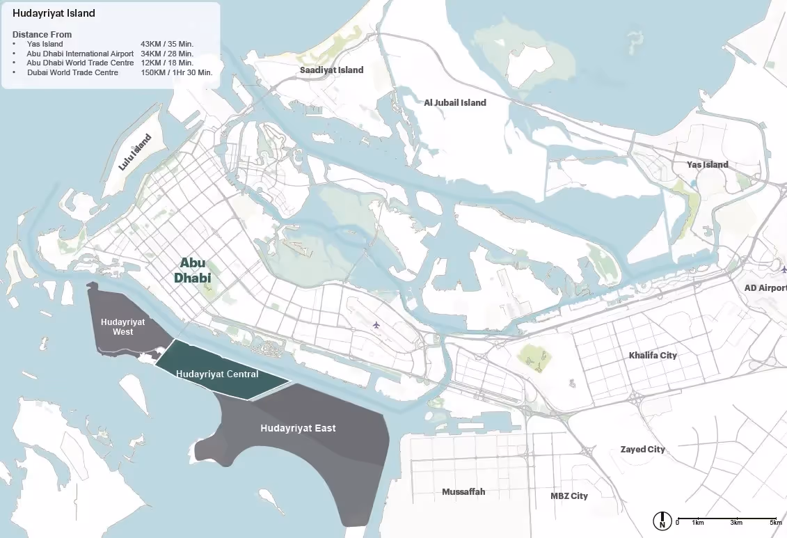 Hudayriyat Island is located in the southwestern part of Abu Dhabi, connected to the mainland by the Hudayriyat Bridge. The island is about 15 minutes from Sheikh Zayed Grand Mosque and Qasr Al Watan, and within a 30-minute drive to Yas Island, Saadiyat Island, and Abu Dhabi International Airport.