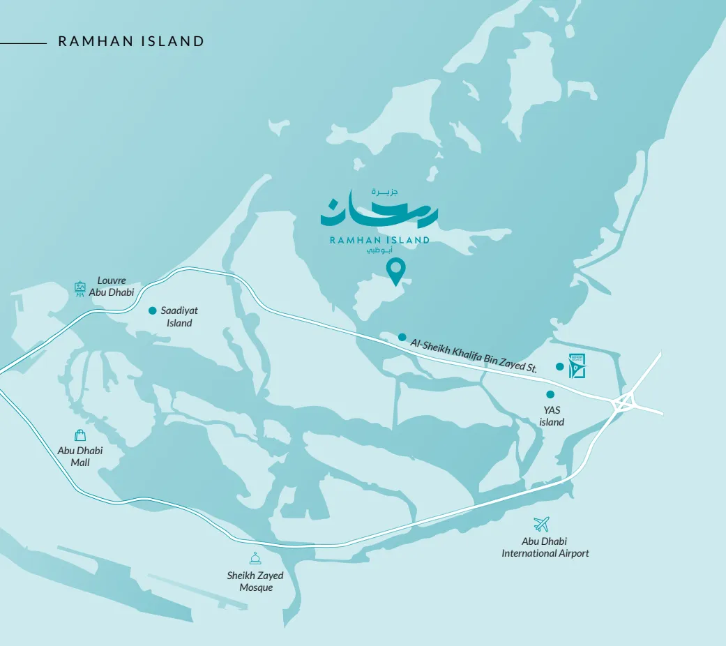 Ramhan Island lies just off Abu Dhabi’s coastline, close to Jubail Island, Yas Island, and Saadiyat Island, with fast access to the city via a planned bridge.