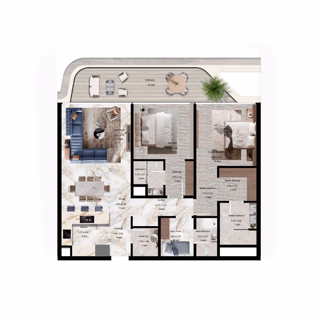 Die Residenzen bieten eine breite Auswahl, von stilvollen Studios bis hin zu großzügigen Sky Mansions mit Größen von 50 m² bis zu 2.209 m². Die Anwesen, die zwischen 3 und 5 Schlafzimmern bieten, befinden sich entweder direkt am Strand, am Kanal oder in einem Naturschutzgebiet. Die Villen bestechen durch ihre außergewöhnliche Privatsphäre und weitläufige Räume, mit Größen von 250 m² bis zu 480 m². Für diejenigen, die ein noch exklusiveres Erlebnis suchen, bieten die Canal Mansions mit 6 Schlafzimmern einen atemberaubenden Blick auf den Kanal, während die Beachfront Mansions mit 7 Schlafzimmern und einer Fläche von 1.500 m² über einen eigenen Strandzugang verfügen.