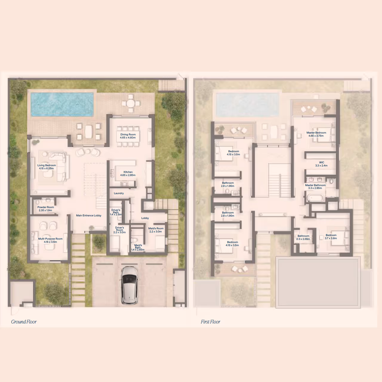 Bayn by Ora offers a wide range of villas and townhouses. Options include 3–4 bedroom townhomes, 3–4 bedroom Core Villas, 4–5 bedroom Gemini Villas, and 4–5 bedroom Double Height Villas, with sizes ranging from approximately 2,300 to 7,900 sq. ft.