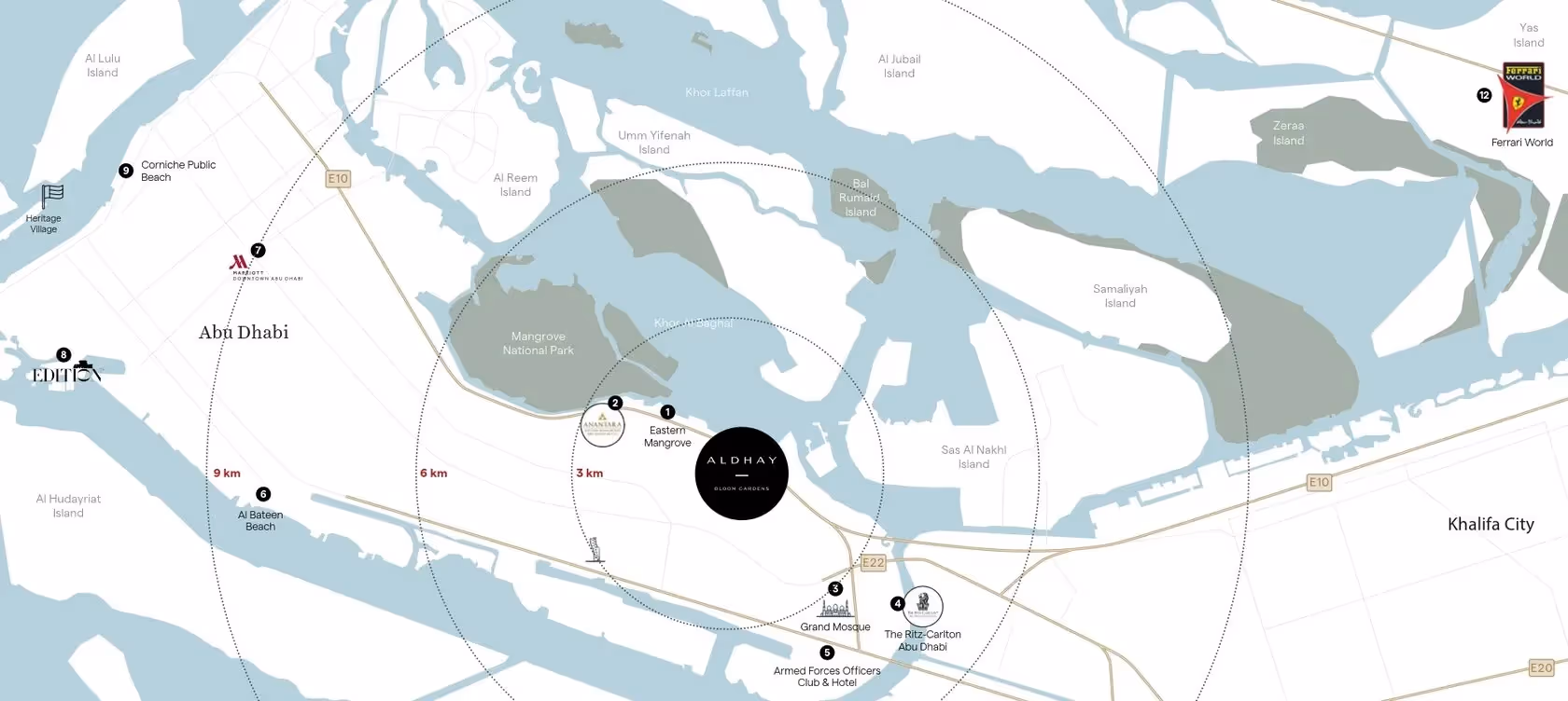 - 20–35 minutes Abu Dhabi International Airport, Saadiyat Island, Yas Island