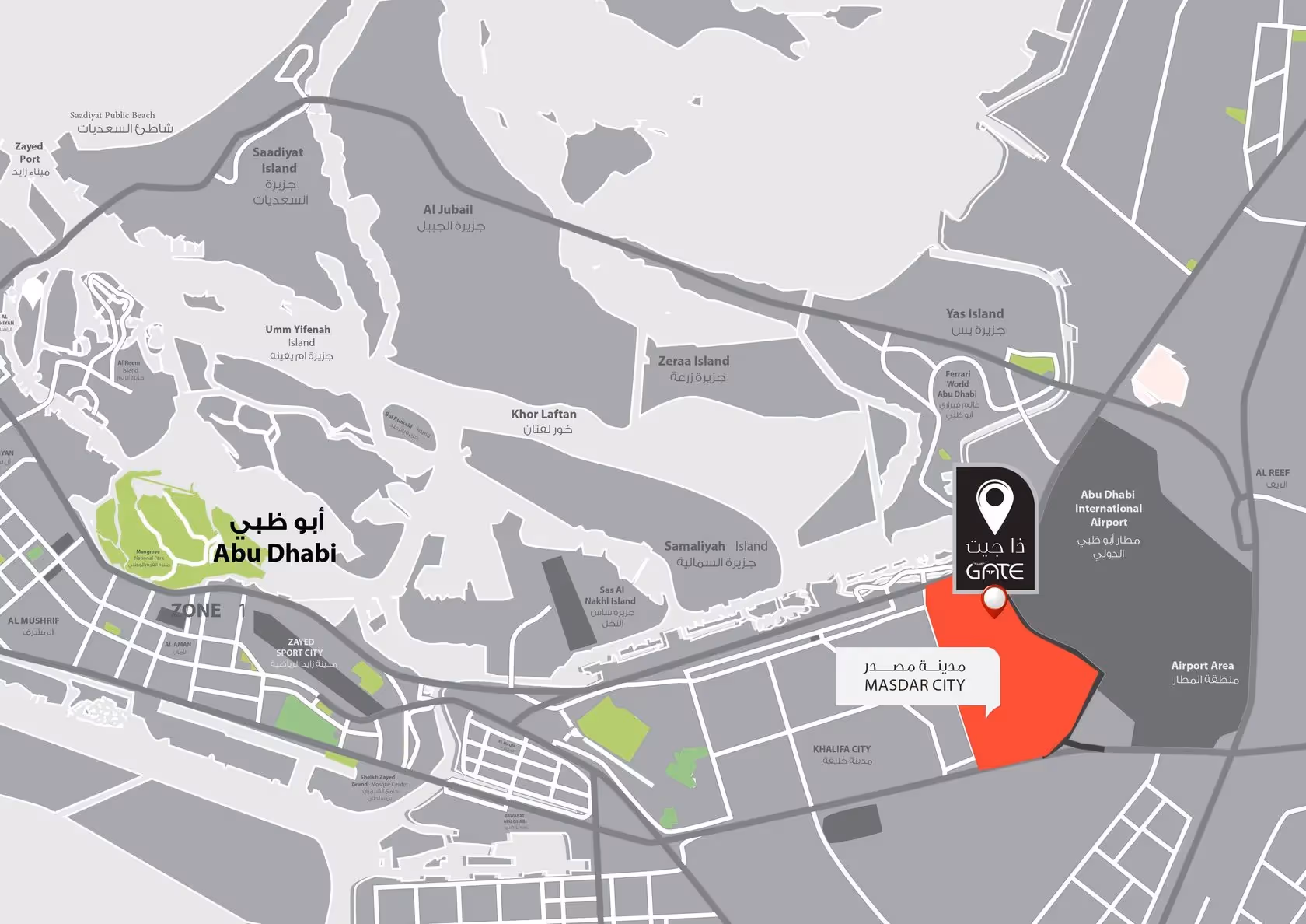 Masdar City, where The Gate is located, is a rapidly growing clean-tech cluster with business-free zones. Located here is the Masdar Free Zone, which is an economically free zone, in which foreigners are allowed to conduct business without involving local partners. This is an additional opportunity for doing business with no duty and zero taxation. Therefore, properties in The Gate are ideally suited for entrepreneurs and business professionals.