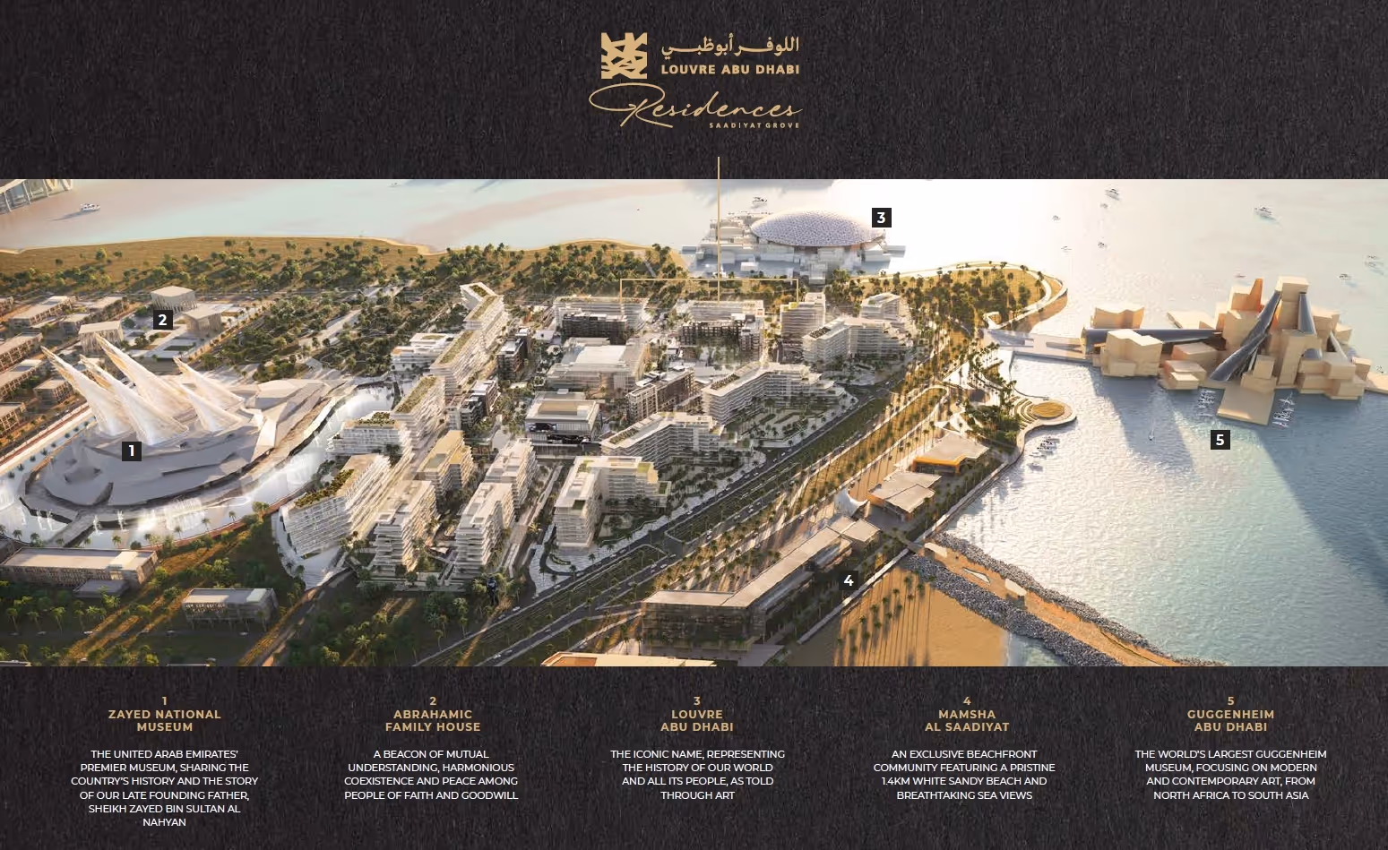 Жилой комплекс Louvre Abu Dhabi Residences, строительство которого начнется в 1 квартале 2022 года, представляет собой ультра-роскошный жилой комплекс в новом районе Saadiyat Grove на острове Саадият. Крупнейший застройщик ОАЭ, компания Aldar Properties сотрудничает со всемирно известным Лувром Абу-Даби для создания первых в мире резиденций под брендом музея. Потенциальные покупатели недвижимости имеют возможность выбрать из множества изысканных студий и апартаментов от одной до трех спален, с панорамными окнами, выходящими на культовый Лувр Абу-Даби, крупнейший культурный проект Франции за границей.