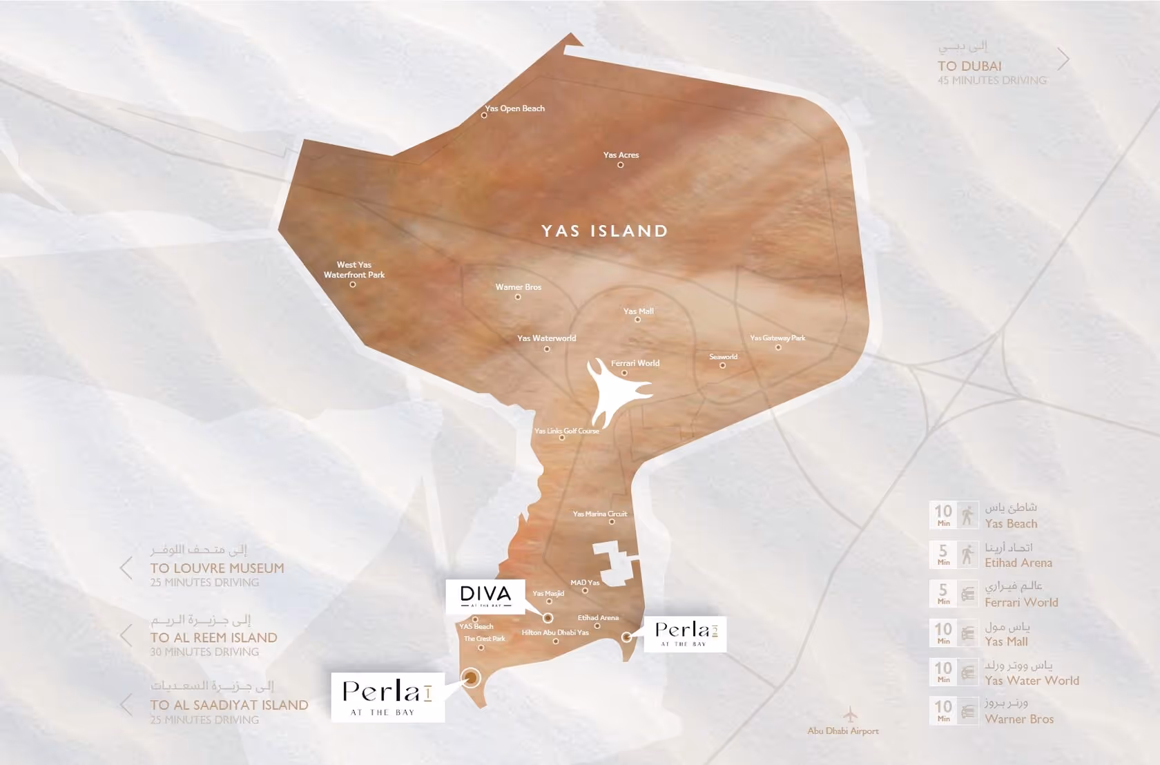 На таком же расстоянии расположены: ночной клуб MAD Yas Island, мечеть Yas Masjid, концертная площадка Du Forum, парк The Crest Park, а также прогулочная набережная The Waves Park. В то же время, до всемирно-известных достопримечательностей острова Yas Island можно будет добраться в пределах 20 минут езды на общественном транспорте или 5 минутах езды на авто. К ним относятся, парк аттракционов Ferrari World и Formula Rossa, трасса для картинга Yas Kartzone, аквапарк Yas Waterworld Abu Dhabi и пр. Помимо этого, после окончания всех строительных работ в районе Yas Bay, жители Perla II получат легкий доступ к 2 школам, мечетям и 19 паркам отдыха, а также к другим необходимым удобствам.